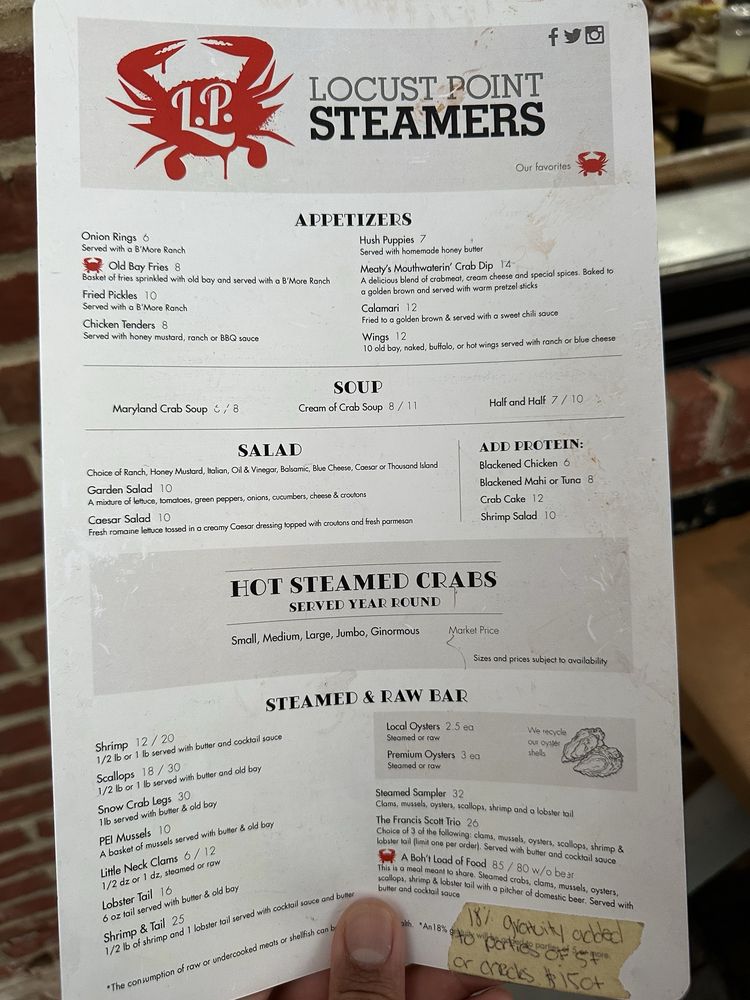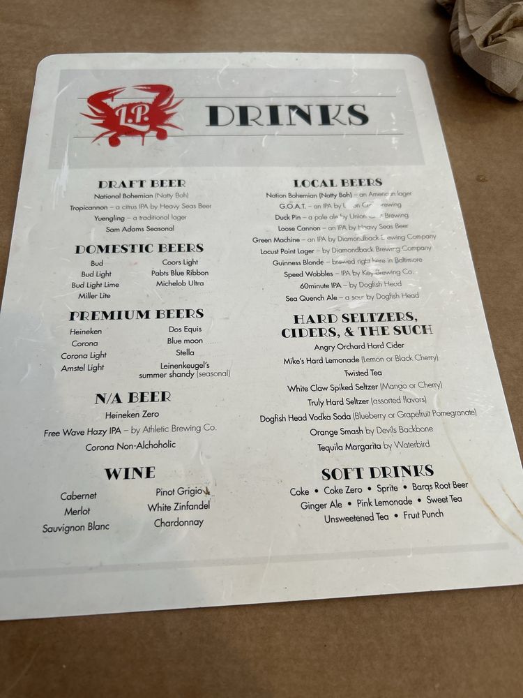 Introducing the menu at L P Steamers, a seafood haven in Baltimore, Maryland. This casual eatery offers a variety of options for seafood enthusiasts, including blue crabs in different sizes, cream of crab soup, shrimp, and crab cakes. Customers rave about the fresh and tasty crab dishes, with some complimenting the creaminess of the soup and the perfectly fried onion rings. The restaurant provides a laid-back atmosphere with outdoor seating and a roof deck for enjoying your meal in the sunshine. With options for delivery, takeout, and catering, L P Steamers makes it easy to enjoy their delicious seafood offerings. Whether you're a crab lover or looking for a budget-friendly seafood meal, this place is worth a visit for its fresh and simple approach to seafood cuisine.
